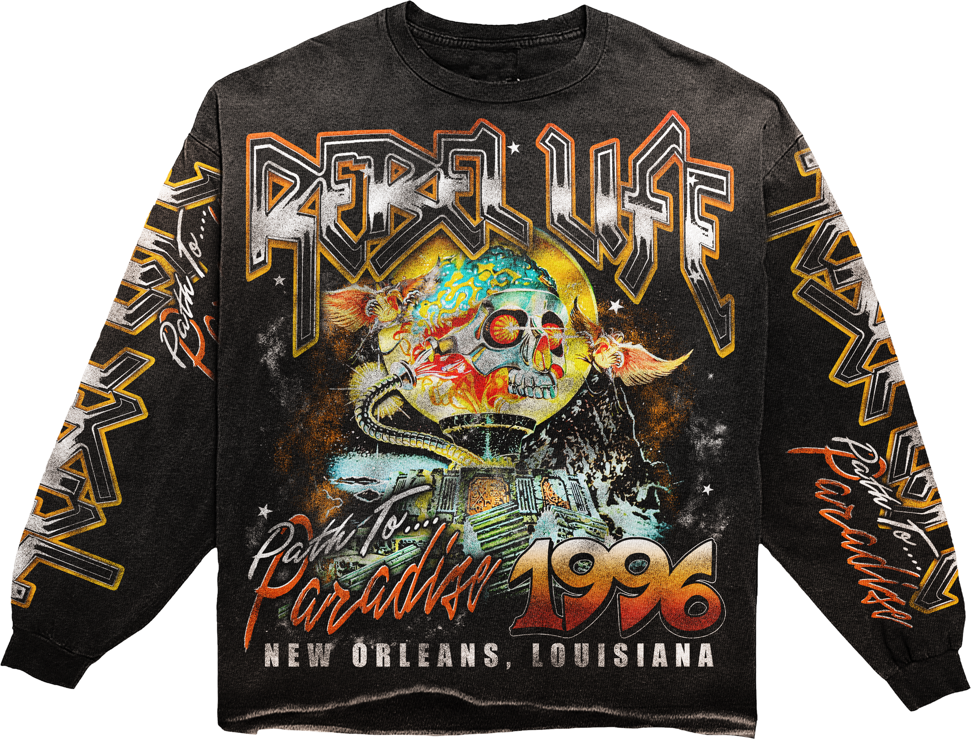 A journey through time, rebellion, and raw imagination. The Path to Paradise Long Sleeve captures the spirit of New Orleans in the late ‘90s — electric, fearless, and unforgettable. Featuring a custom cosmic skull, bold distressed lettering, and sleeve-to-sleeve detailing, this piece is a standout from the Path To Paradise.